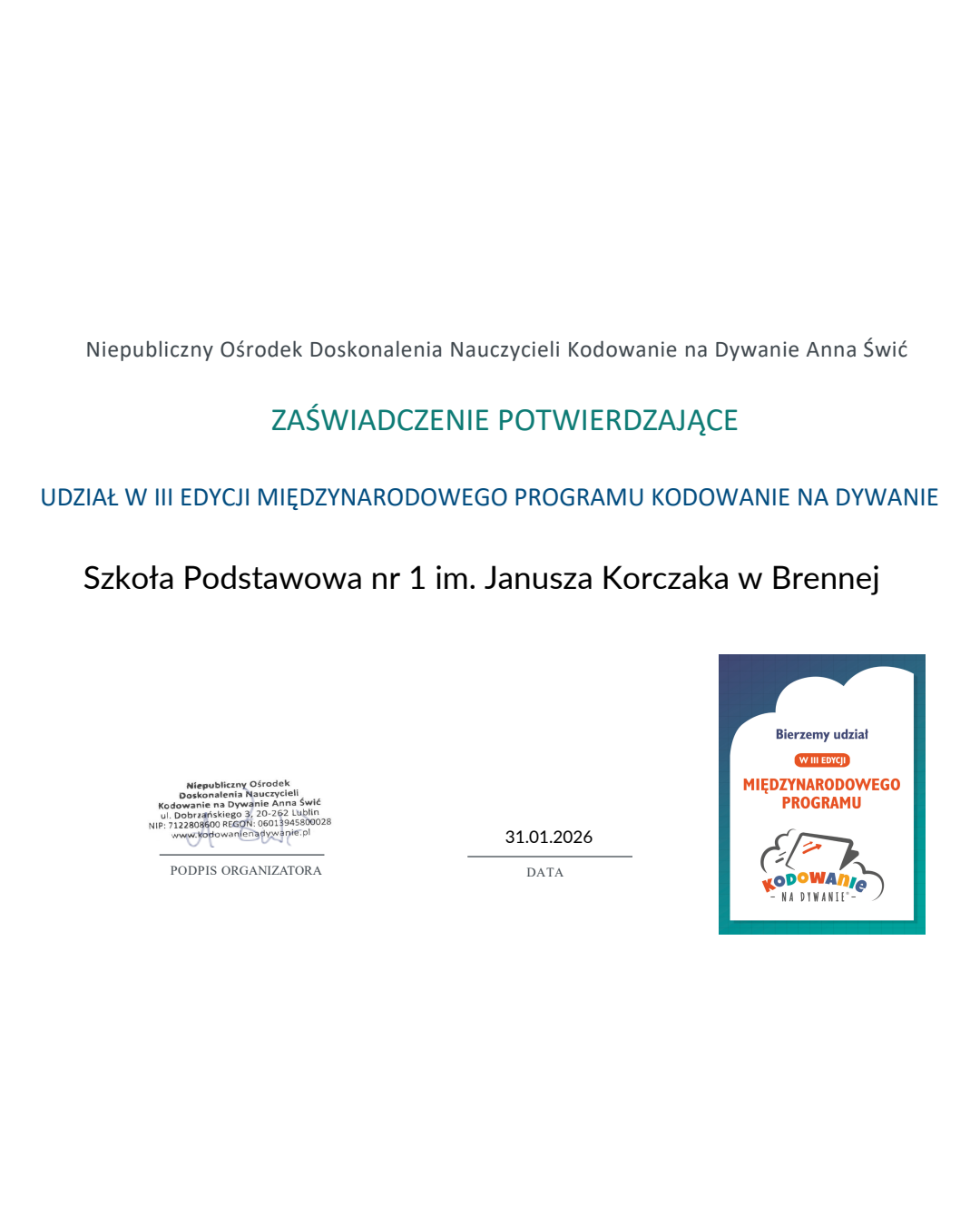 Klasa 2a w okresie od 25.09.2025 do 29.01.2026 realizowała innowację pedagogiczną pt. „Kodowanie na dywanie”.